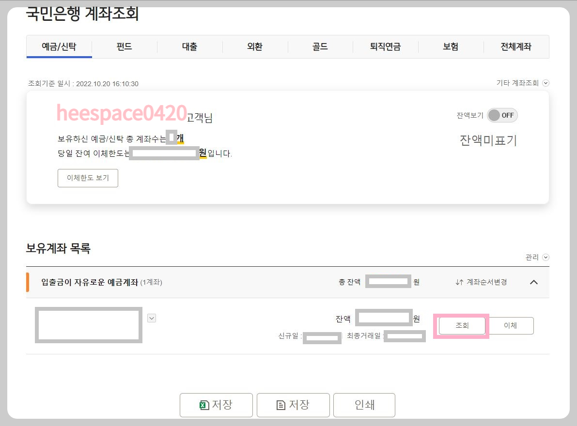 3. 계좌목록 중 "입출금거래내역상세보기"하고자 하는 해당 계좌를 선택한다