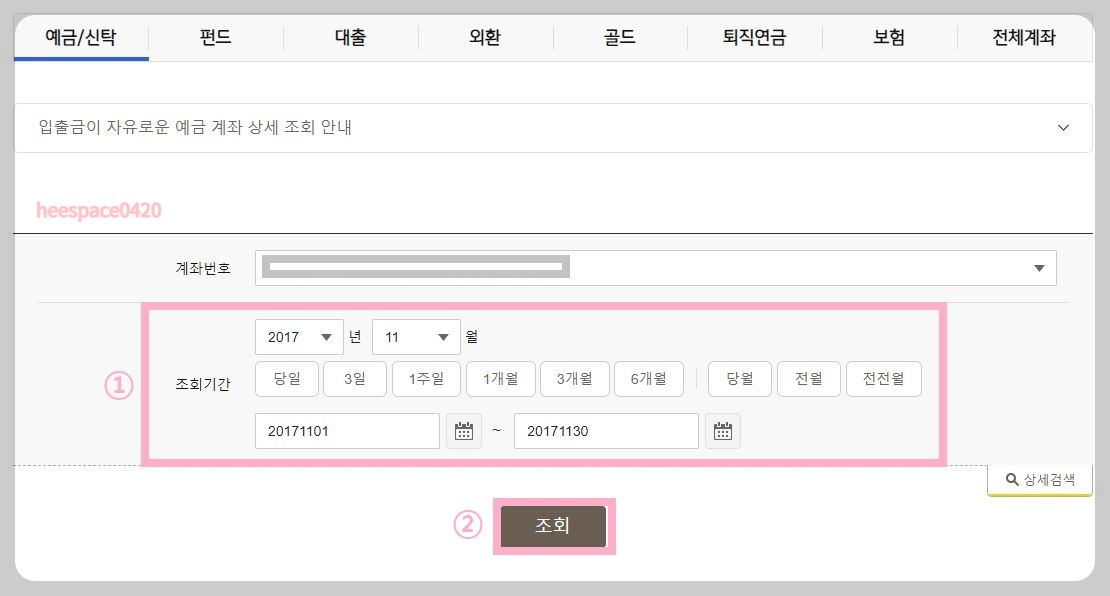 3. 계좌별내역조회->조회기간설정->조회를 선택한다